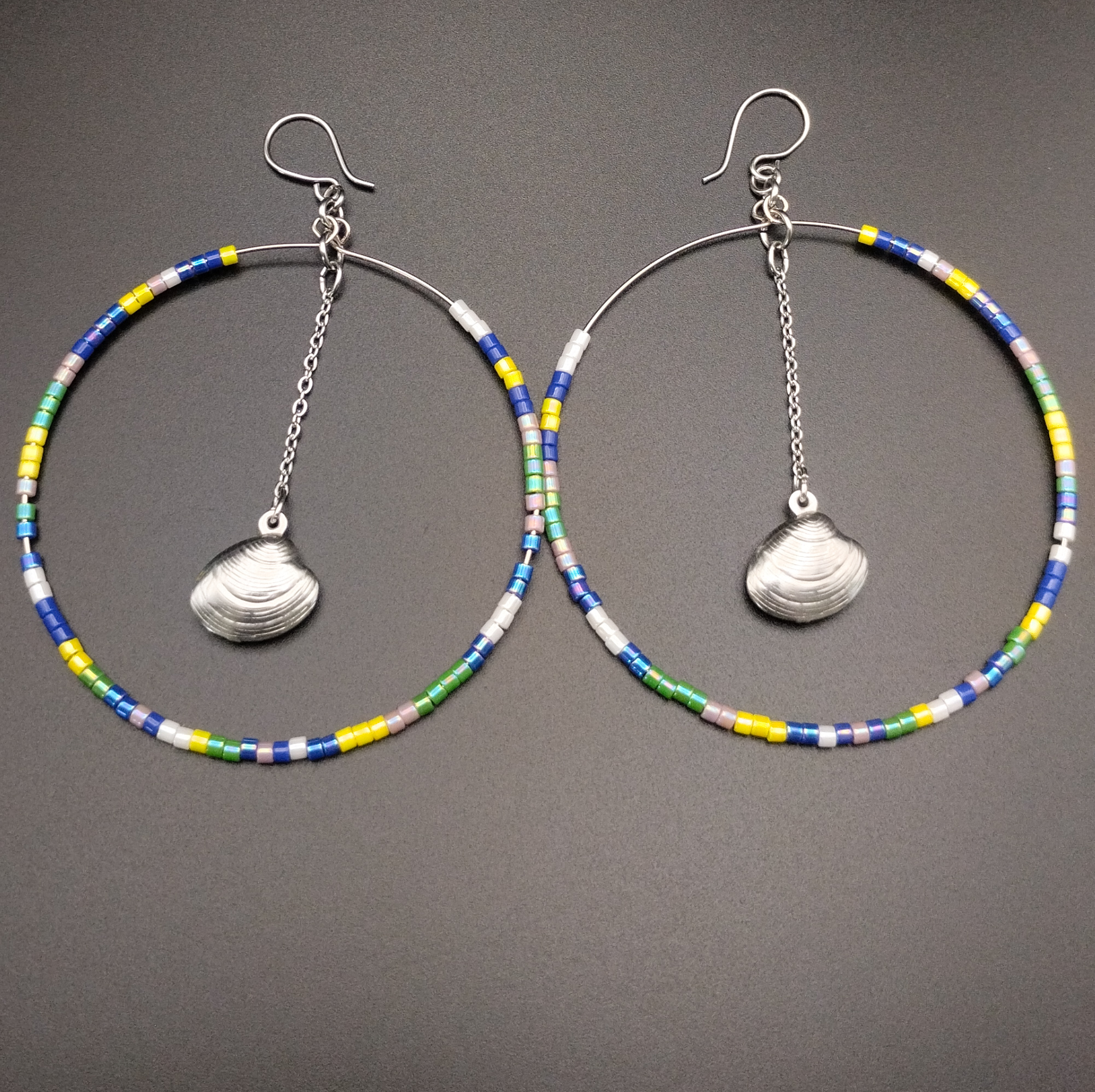 Boucles d’oreille créoles en acier décorées de perles de rocaille Delica, perles japonaises et d’un jolie breloque coquillage. Marine et printanière.