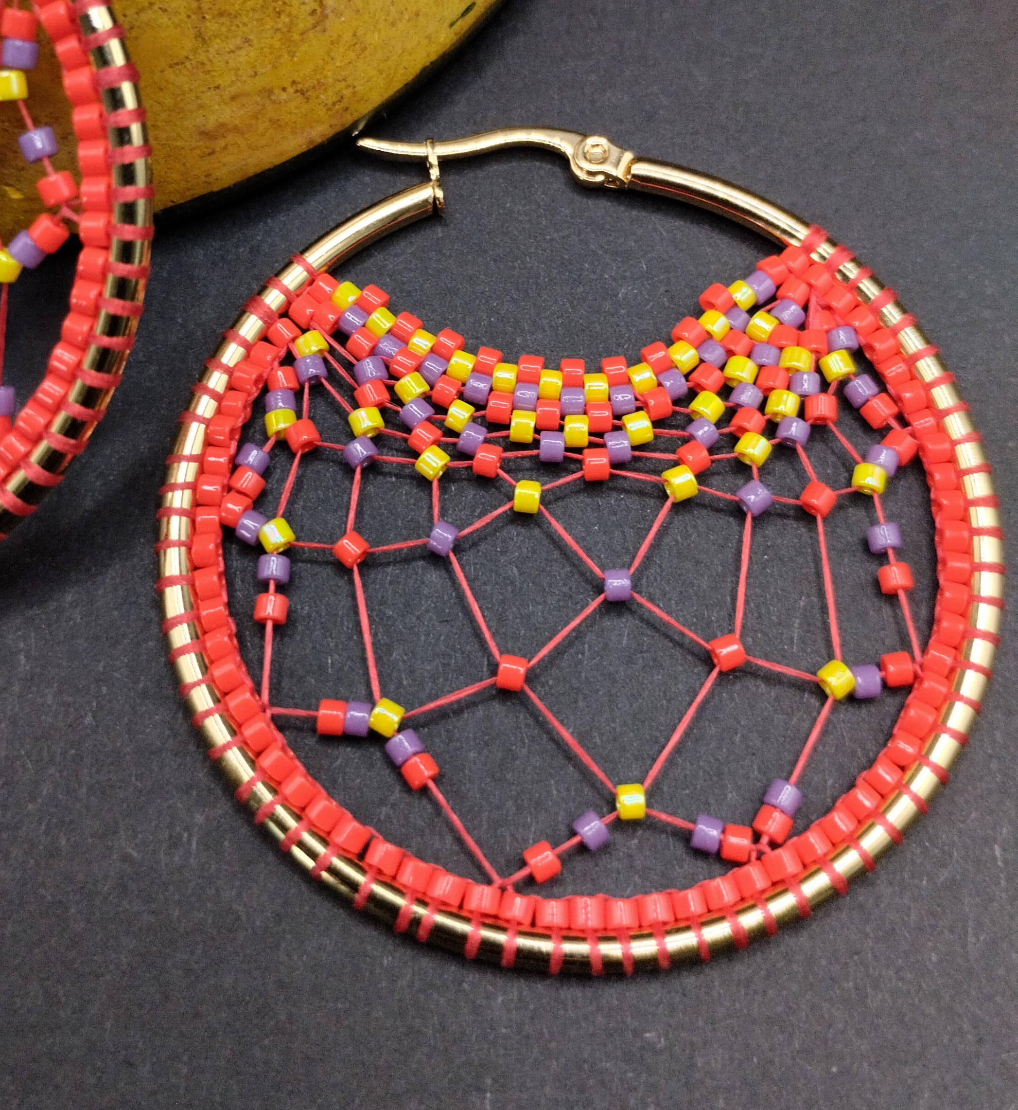Boucles d’oreille créoles en acier doré décorées par des perles tissées aux magnifiques couleurs vives. Perles de rocaille Miyuki de bonne qualité.