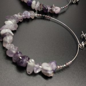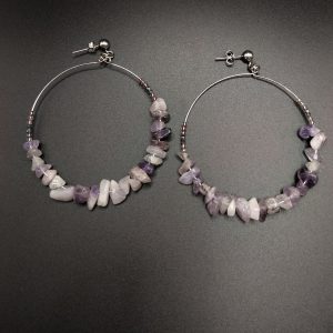 Boucles d’oreille créoles en acier décorées par des perles chip et facettées aux magnifiques couleurs violet, mauve et argenté. Original, Ethnique.