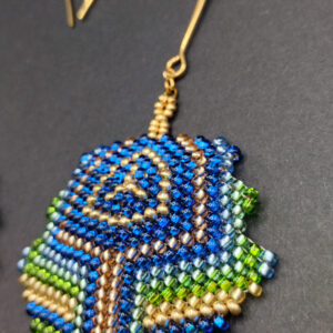 Boucle d’oreille pendante longue de forme triangulaire aux couleurs bleues, dorés, vertes. Hope est moderne et ethnique. Un bijou sonore, spectaculaire.Tissée à la main, cette pièce ne passera pas inaperçue.