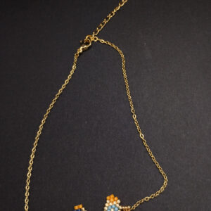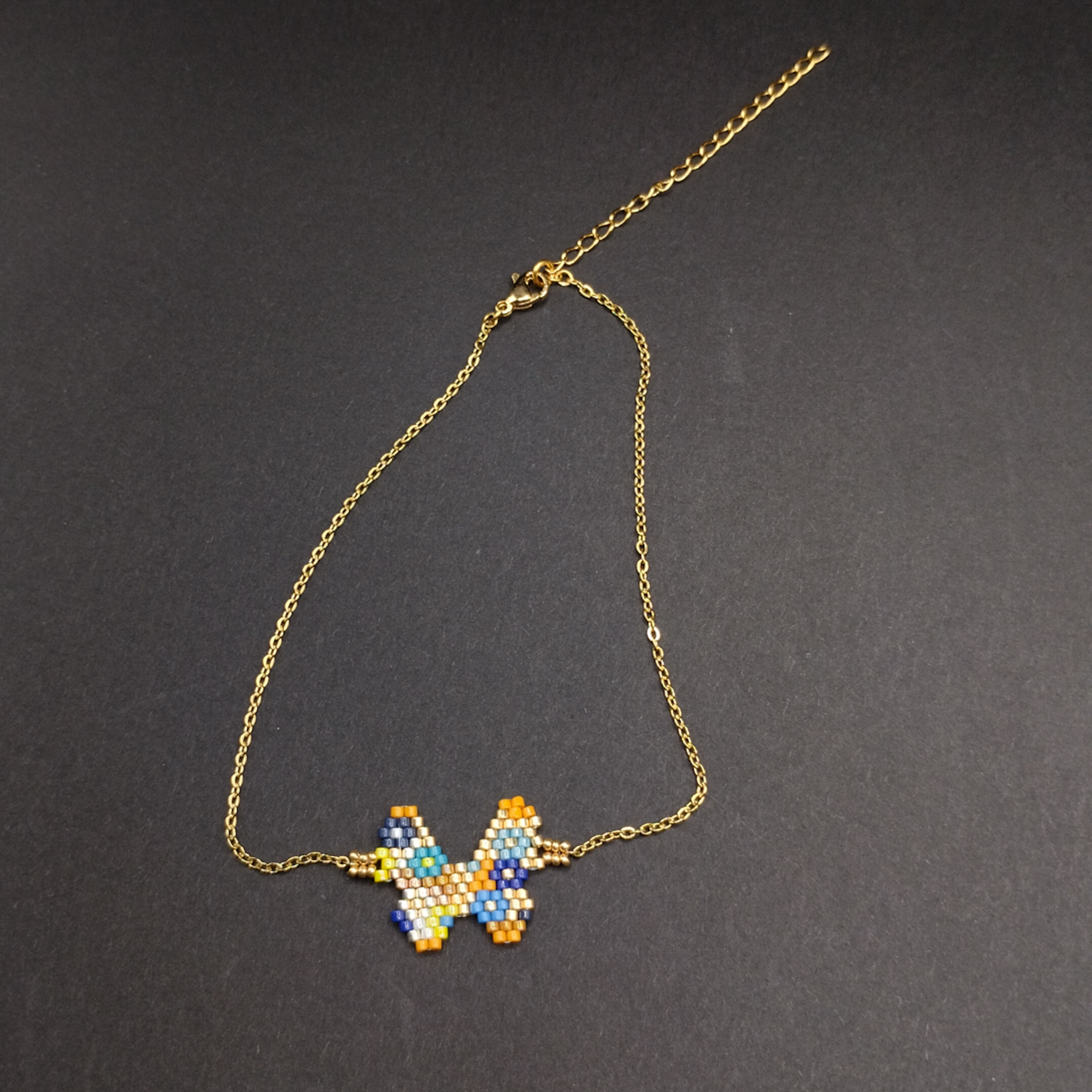 Bracelet de cheville en chaine décoré avec un beau papillon tissé avec des perles de rocaille et une fine chaine dorée. Léger, original. Beau contraste de couleurs. Facile à porter.