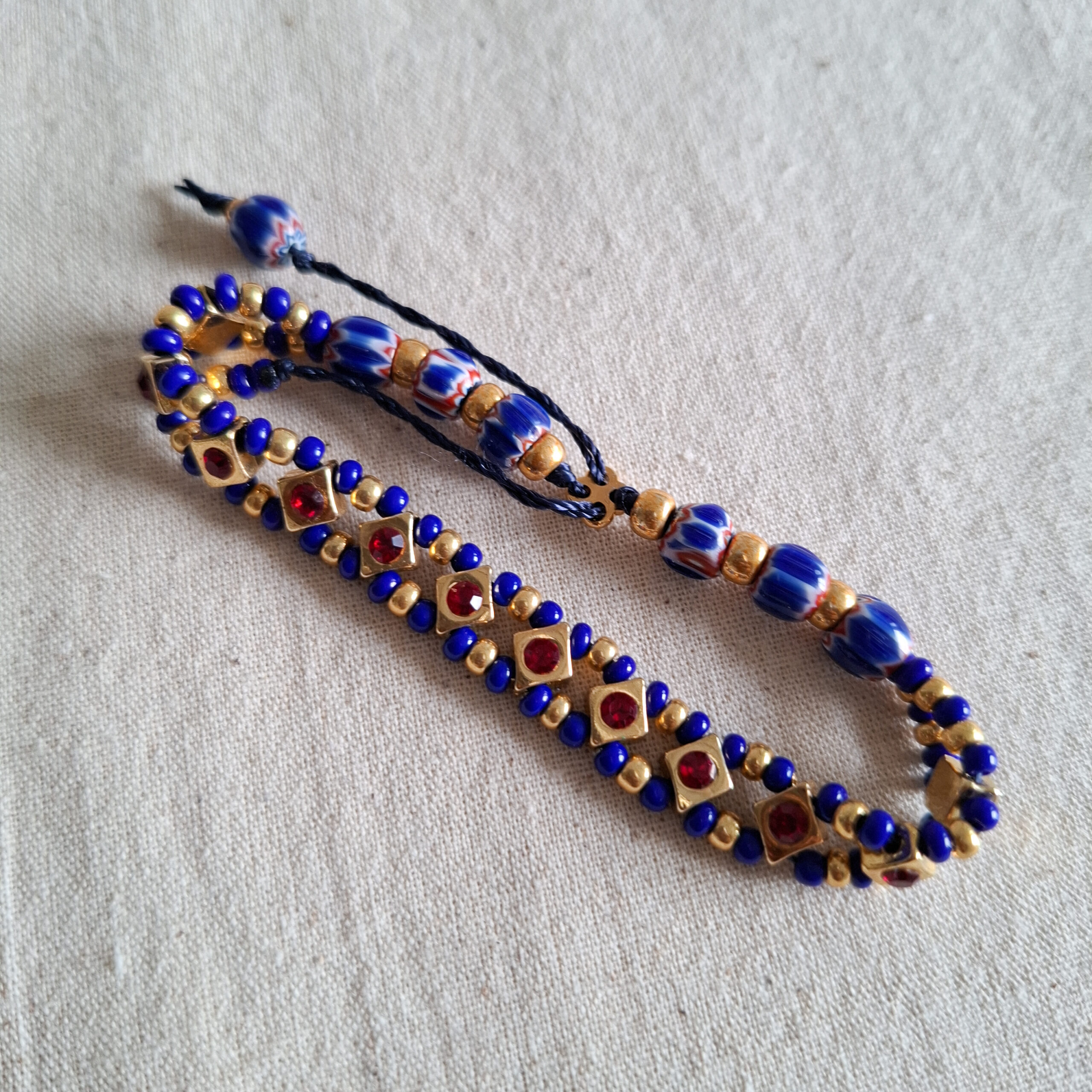 Les perles de rocaille sont de petites perles en verre, de forme cylindrique ou arrondie. Elles se déclinent en de multiples couleurs. J’ai opté ici pour des perles rondes dorées. Le bracelet a également des perles millefiori. Ces perles en verre à motifs sont ravissantes. J’ai opté pour des tons bleus et rouges. Les perles spacers sont dorées et décorées de perles rouges au centre. Fermoir ajustable doré à l’or fin. Le cordon est en fil de jade de couleur bleue.