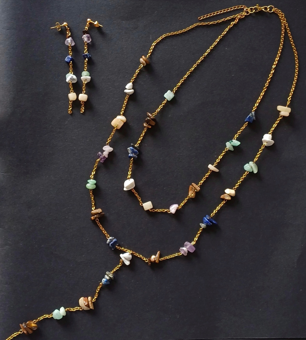 L’ensemble Collier et boucles d’oreille Pierres Fines est en acier et pierres fines (lapis lazuli, pierre de lune, oeil de tigre, howlite et d’autres). En effet, l’acier inoxydable est facile à entretenir. Car il ne s’oxyde pas. Ainsi, il est un bon allié pour les perles en général.