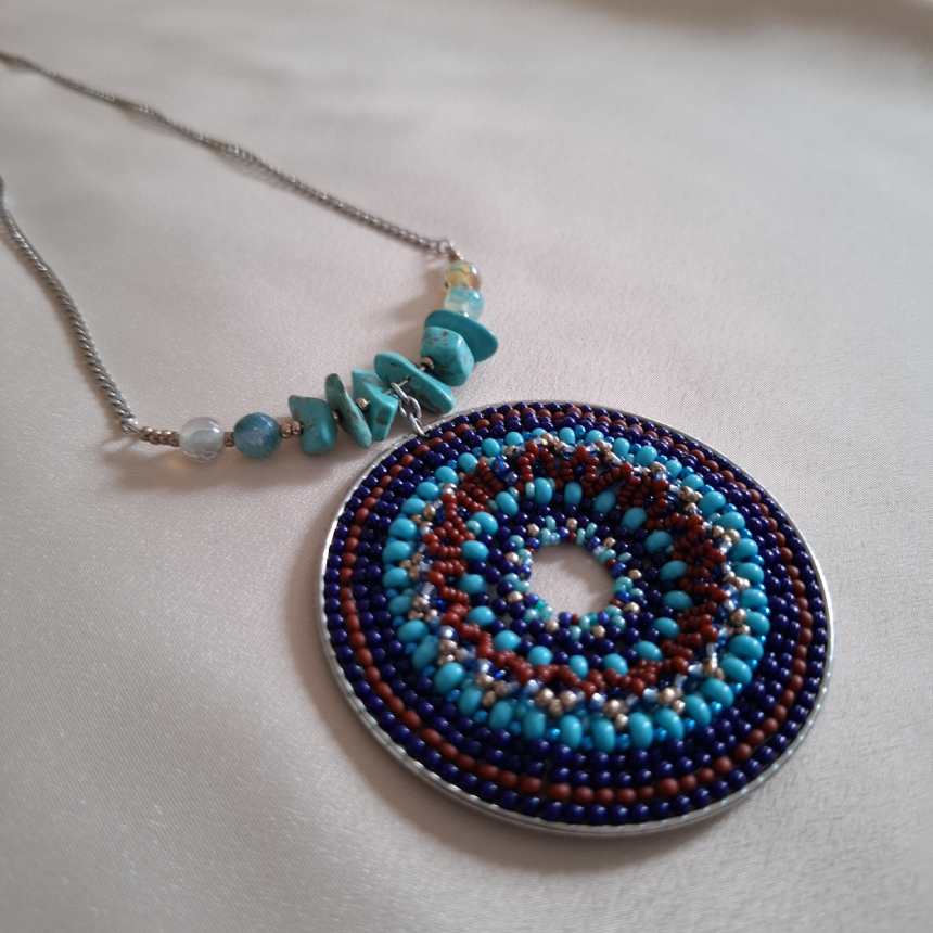 La pièce focale du collier est un large pendentif turquoise et agate. Les perles de rocaille sont tissées à la main dans un anneau circulaire. La succession de couleurs bleu et marron lui donne un côté somptueux et folklorique. Les pierres fines et imitation de pierres fines complètent ce collier ethnique. La chaîne se termine avec un fermoir mousqueton avec une chaînette d’extension.