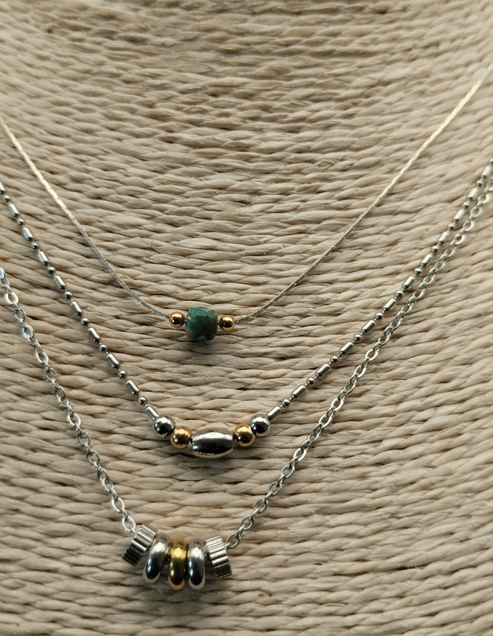 Noelle symbolise la simplicité et le raffinement. Collier trois rangs aux texturé, doré et argenté agrémenté d’un point de turquoise.On joue la carte de l’élégance à fond.