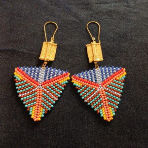 Les parures sont une composition de bijoux assortis. Elles permettent de porter des bijoux qui se complètent. Ainsi, on ne pense plus à quelle boucle d’oreille pour ce collier et vice versa. La parure ethnique perles tissées Ethnic Day est un ensemble collier ras-de-cou à grand pendentif de forme triangulaire et une paire de boucles d’oreille. Cette parure en perles tissées et poids baoulé est colorée et originale. Le poids baoulé est un ornement typique de l’ethnie Akan en Côte d’Ivoire et au Ghana. Ornement autrefois utilisé pour les cérémonies traditionnelles connaît une certaine popularité ces dernières années.