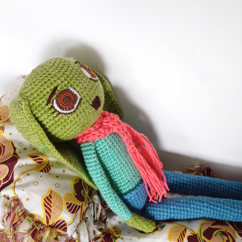 Olive est une grande peluche crochetée en fil synthétique. Elle représente un lapin imaginaire aux longues oreilles et aux couleurs vives. Avec ses grands yeux également réalisés au crochet, elle est gaie et joyeuse.