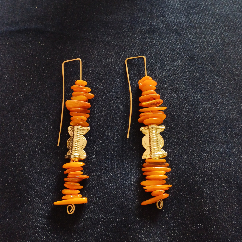 La structure métallique de la paire de boucles d’oreilles est en acier inoxydable. En plus, le placage en or PVD donne une bonne résistance au bijou. Les autres matériaux sont le poids baoulé et les pierres en verre. Les pierres chips sont en verre. Leur forme organique vient de leur coupe aléatoire. Le poids baoulé est un ornement typique des ethnies Akan, qu’on retrouve en Côte d’Ivoire et au Ghana.