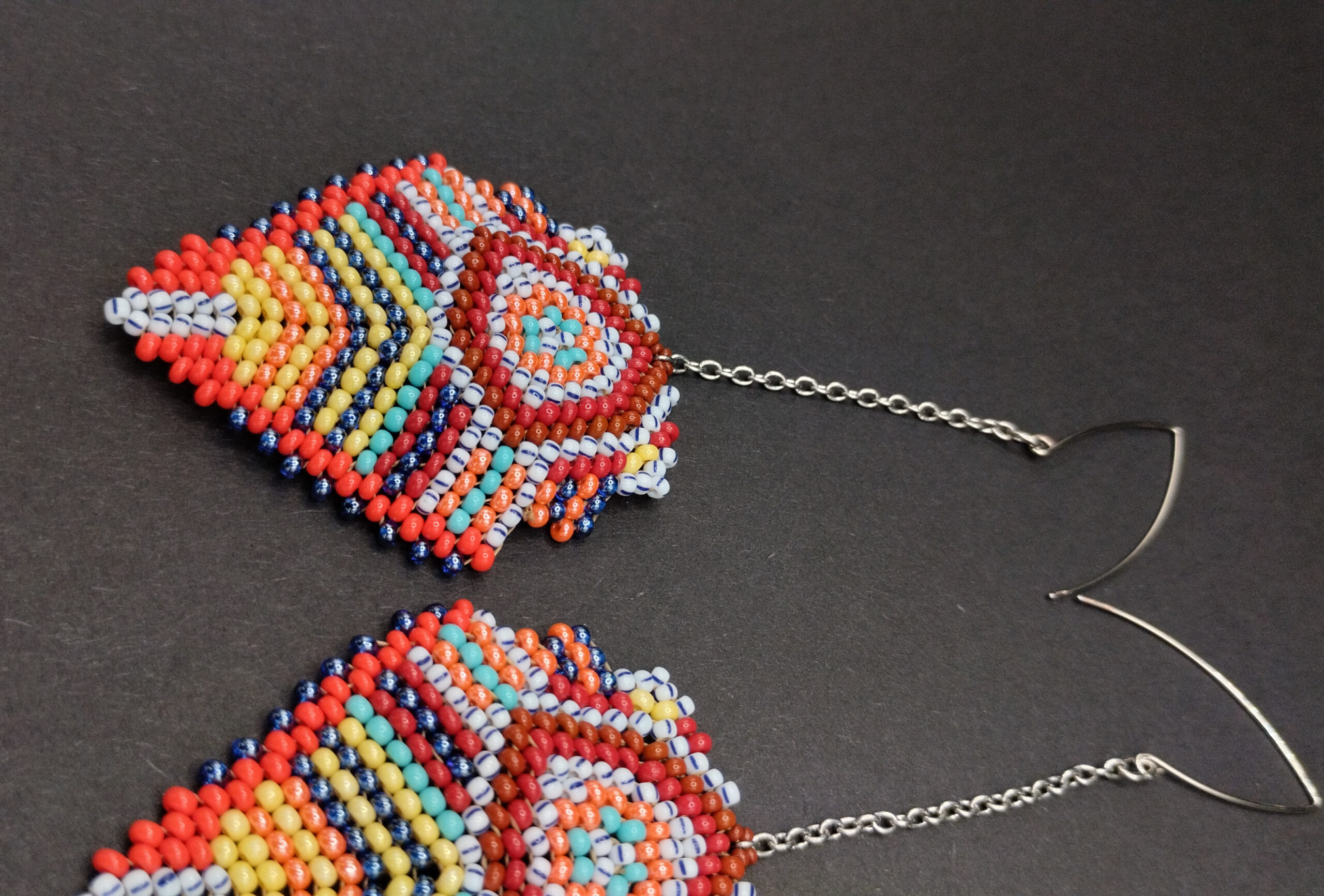 Les pendantes d’oreilles sont des boucles d’oreilles plus ou moins longues qui pendent aux oreilles; Tribe est une interprétation des pendantes d’oreilles en perles tissées. Elles peuvent être en chaînes, en perles ou en combinaison des deux. Les pendantes d’oreilles se portent aux oreilles à l’aide d’un crochet ou d’un clip. Elles peuvent aussi être montées sur des très petits créoles.