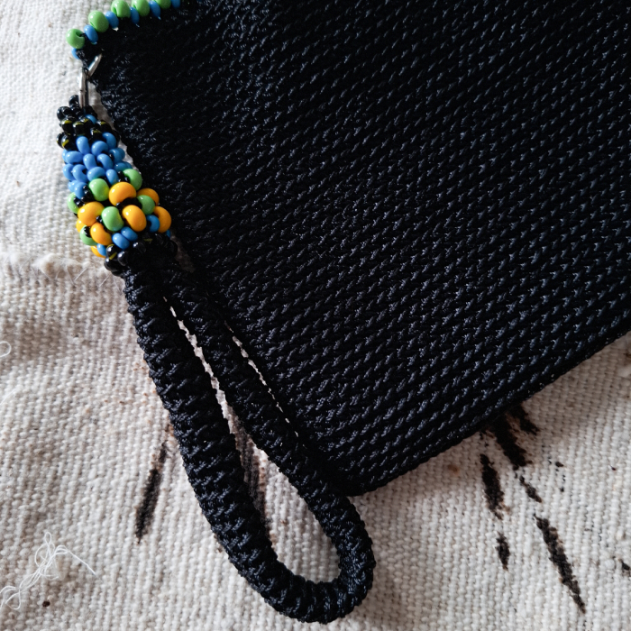 La pochette est entièrement réalisée en fil polyester soyeux de couleur noire. La doublure du sac est en satin noir. L’anse crochetée se termine par des perles de rocaille vertes, jaunes, bleues et noires. Votre pochette devient un bijou. La bordure du sac est en perles de rocaille vertes. Les perles de rocaille sont de petites perles en verre de couleurs et tailles différentes. Elles sont utilisées dans différentes techniques artisanales, notamment le tissage de perles, la broderie et le crochet. Elles servent ici à embellir la pochette