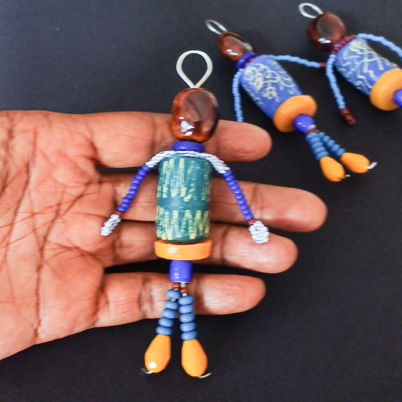 Les porte-clés ou bijoux de sac sont des accessoires personnalisables en terme de couleurs, textures, formes, matériaux. En effet, on les choisit souvent choisis pour ces raisons mais également pour leur utilité. Je vous propose des bijoux de sac faits main avec des perles en verre, céramique, des poids baoulé, ces ornements typiques de l’ethnie Akan en Coure d’Ivoire et au Ghana. Colorés et originaux, des pièces uniques ou en série limitée pour une décoration unique de vos sacs. Le porte-clé Bonhomme est un accessoire drôle, décliné en plusieurs coloris.