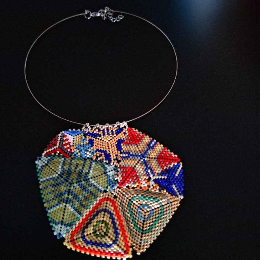 Les perles de rocaille sont des alliées en bijouterie artisanale, spécialement dans le domaine du tissage de perles. Leur palette de couleur stimule la création de bijoux aussi rares, modernes, qu’ethniques. Le collier ras-de-cou grand pendentif Mosaïque vous propose une exploration du tissage Peyote avec des perles Delica de la marque Miyuki.